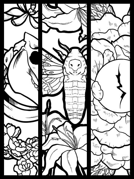 This coloring book is filled with flowers, skulls, and eyeballs. Do you dare look inside?