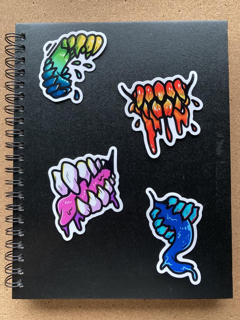 Colorful set of four monster teeth designs! These stickers are roughly 3x4 inches and cut with a border to let their colors pop. Each sticker has a gloss finish and is watermark free to show off all their monstery details on wherever you decide to stick them! You will receive one of each design when purchased.